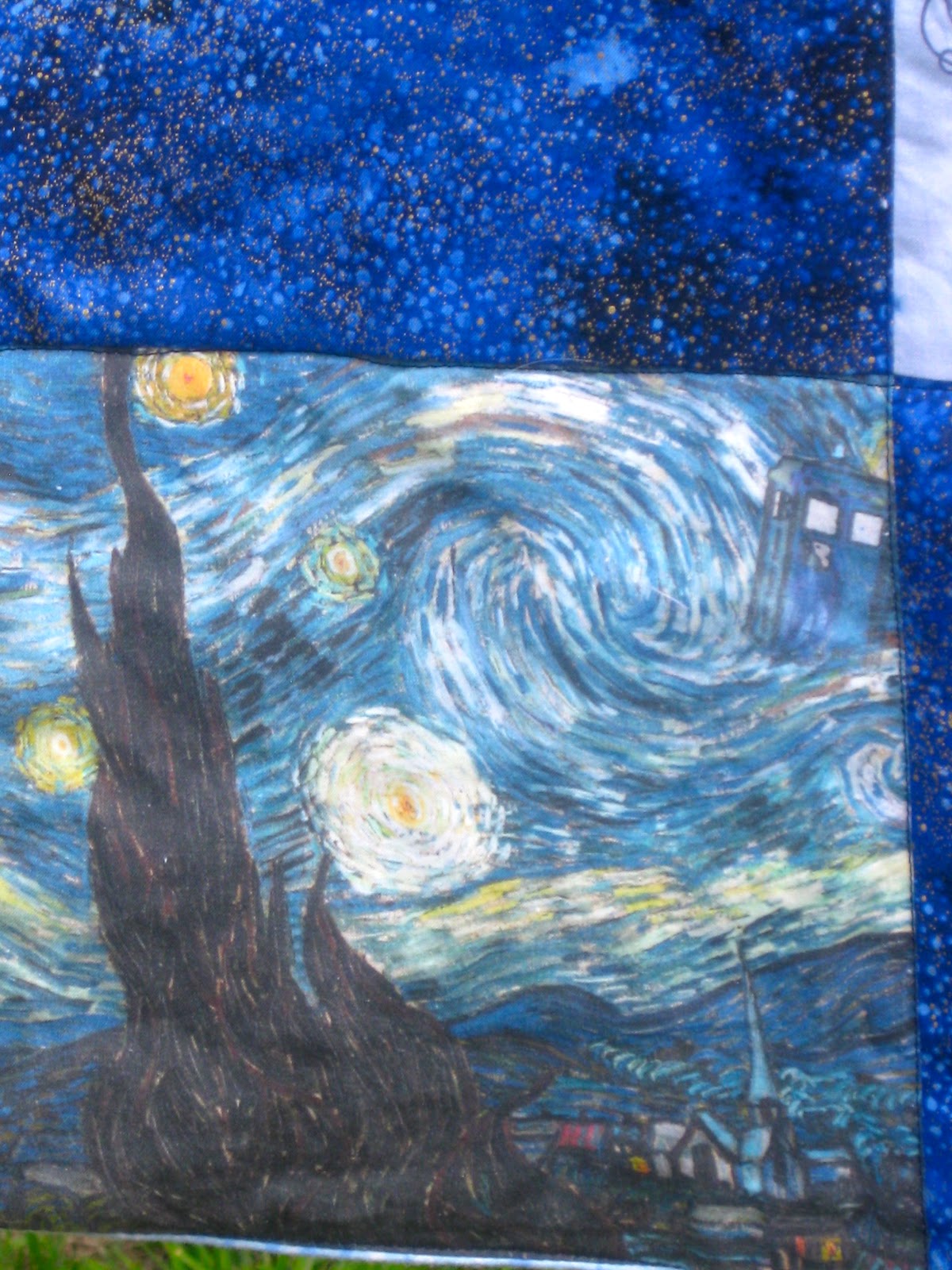 Not nerdy so much as AWESOME! My sisters and I (and anyone worth their salt) are huge Doctor Who fans and you can actually find Doctor Who fabric on Spoonflower (tons of it really). I knew my sister would be totally shocked to open a Doctor Who quilt.